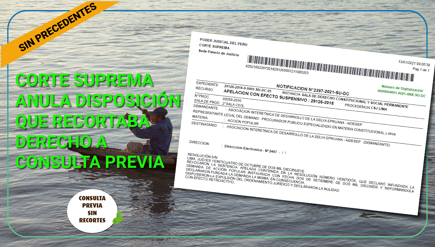 Lima, 13 de enero de 2021.- Tras un largo proceso judicial de casi 5 años, hoy miércoles 13 de enero la Corte Suprema notificó una sentencia histórica al dictaminar que se anule la disposición que evitaba que se consulte las medidas relacionadas a servicios públicos que afecten a los pueblos indígenas, tales como la construcción de carreteras, aeropuertos, hidrovías, líneas de transmisión eléctrica, entre otras.